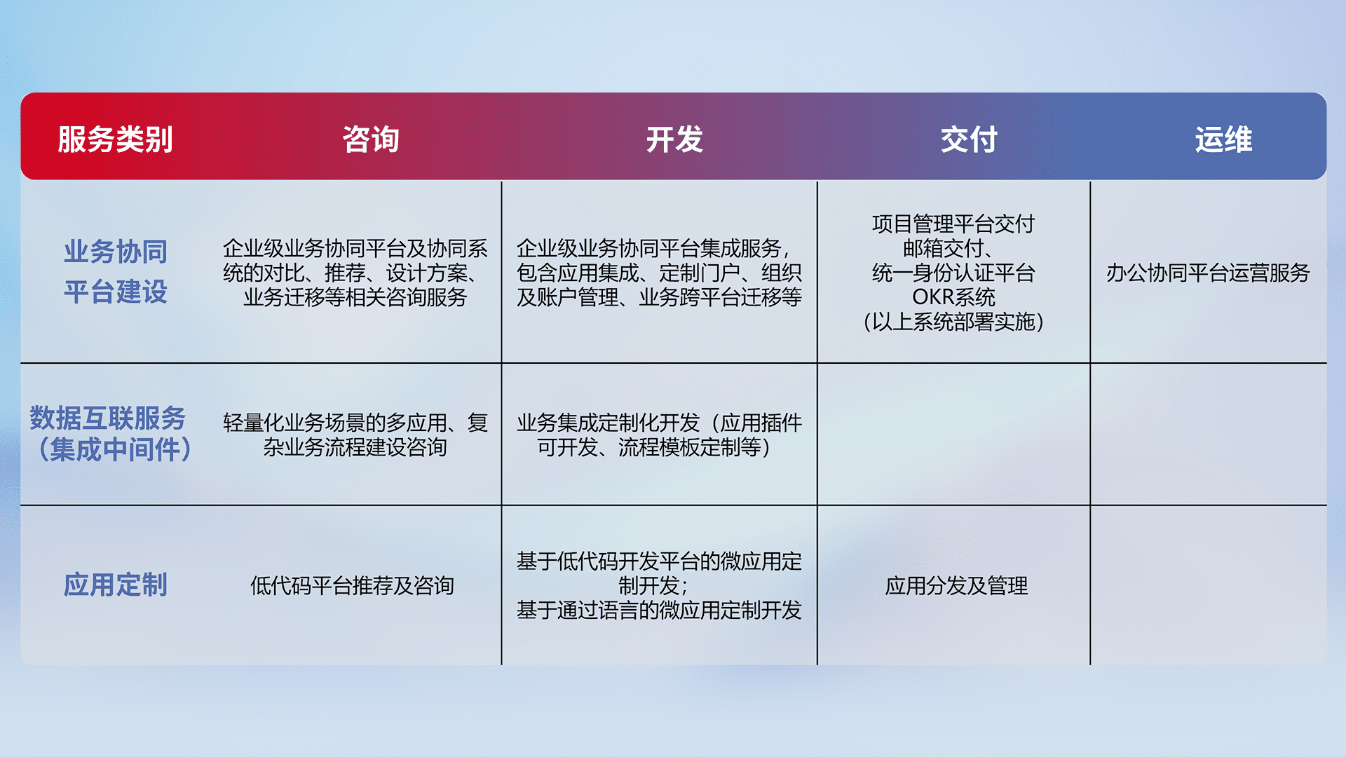 针对钉钉、、、企微、、、IDaas等平台级产品提供产品的规划、、、、方案、、、、交付、、定制化开发等服务,,实现如统一协同办公、、智能客户服务、、、混合会议管理、、、、智能数据查询、、、、等业务场景,,,,实现数字化转型。。