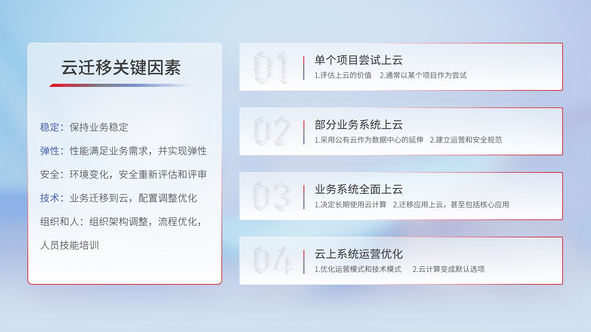 结合实际业务,,,,从规划设计、、、、云平台选型、、云原生改造、、、、数据迁移、、集成交付,,,迁移全过程为客户识别最佳上云路径,,,做好风险识别管理,,,设计网络架构、、、、身份权限、、安全审计合规、、操作审计、、、日志审计、、、监控告警策略、、多站点容灾设计等,,,对云上基础设施进行整体规划,,,提升IT治理水平,,以满足弹性、、、高可用、、、、高性能的需求。。。