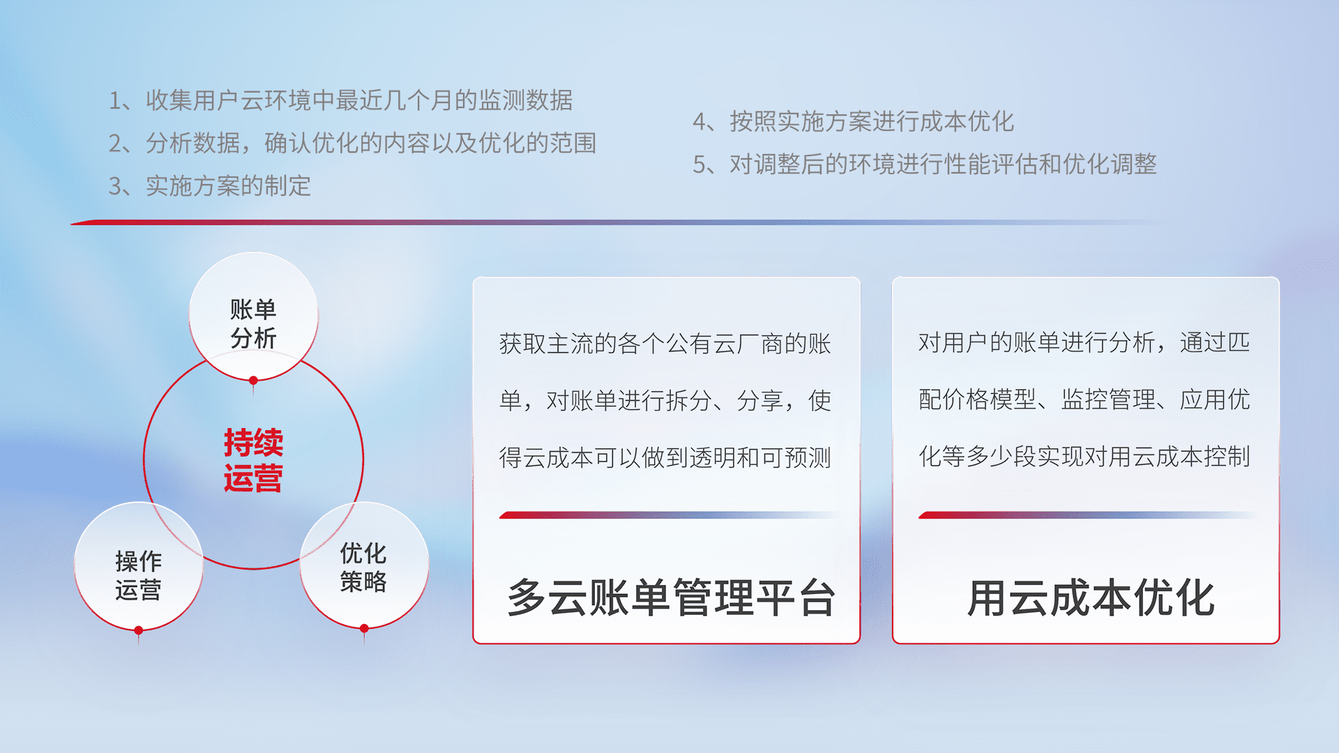 通过多云纳管,,以统一的资源数据模型把客户的云资源进行抽象和封装,,,进而实现对多云资源的统一操作,,保障云资源管理的可靠性、、、、稳定性与可用性。。。量身定制化运维内容,,,配置、、、开发运维、、补丁管理、、备份、、、、监控、、认证和访问管理、、、审计和日常巡检等,,,保障在用云过程中的可靠度,,稳定度以及高可用率。。